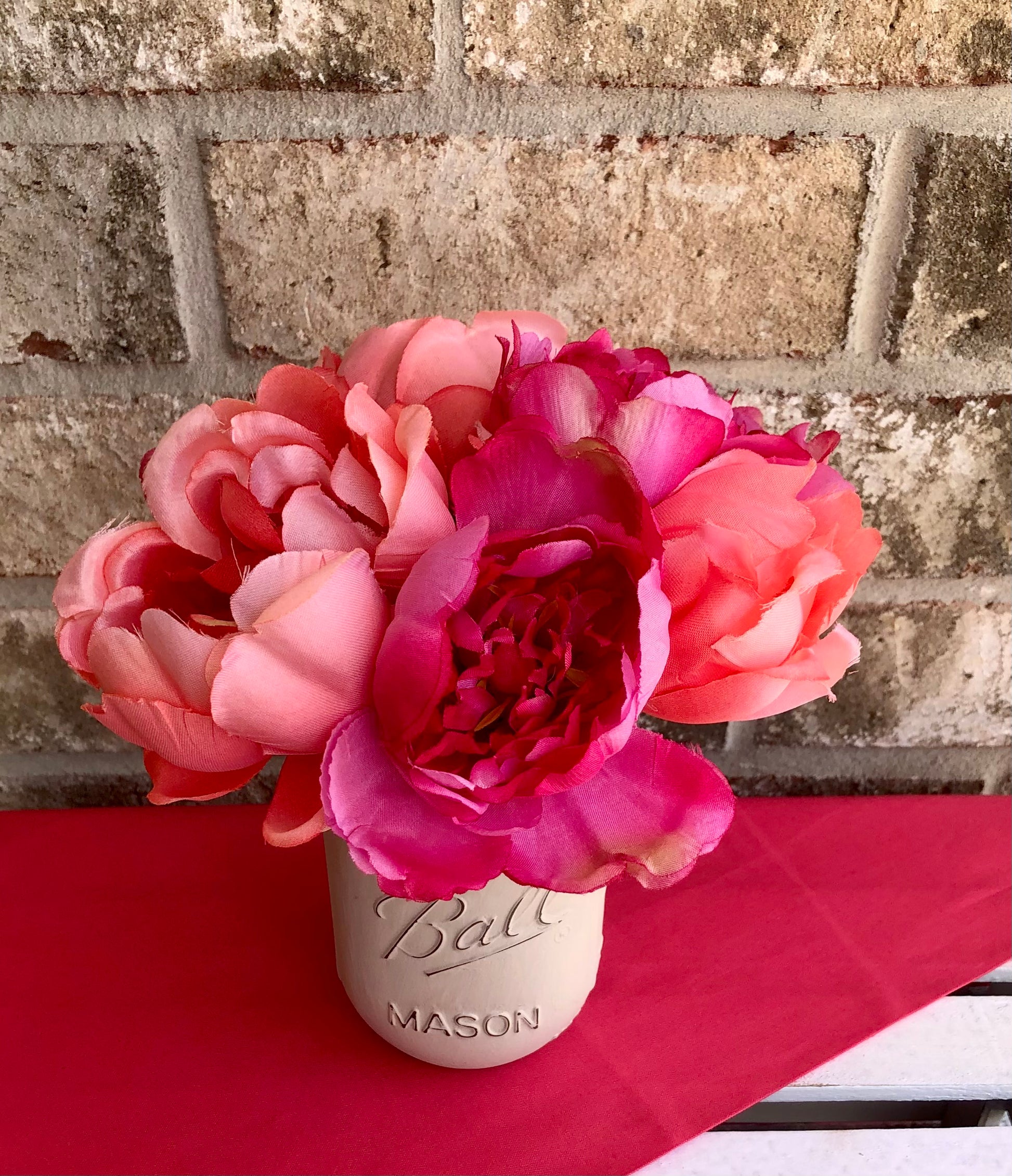 We love the color combo in this peony flower arrangement! These gorgeous peonies are rich in vibrant shades of pink and coral that will brighten any room! Elegantly styled in a customizable pint size Ball mason jar, this farmhouse floral centerpiece measures approximately 9 inches tall and 9 inches wide.